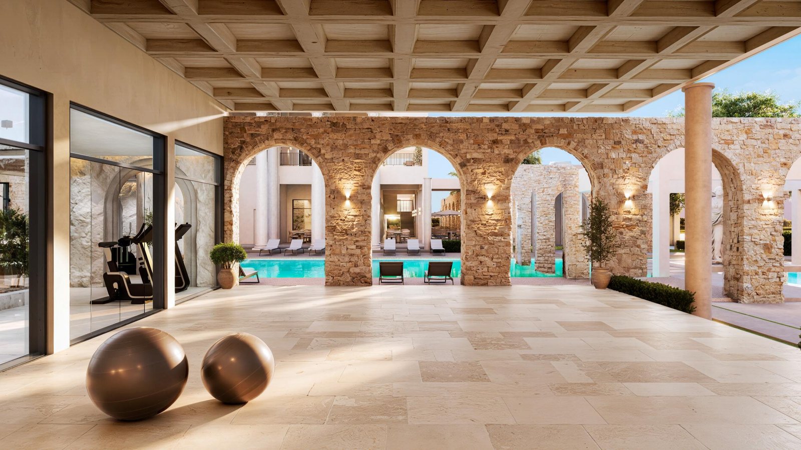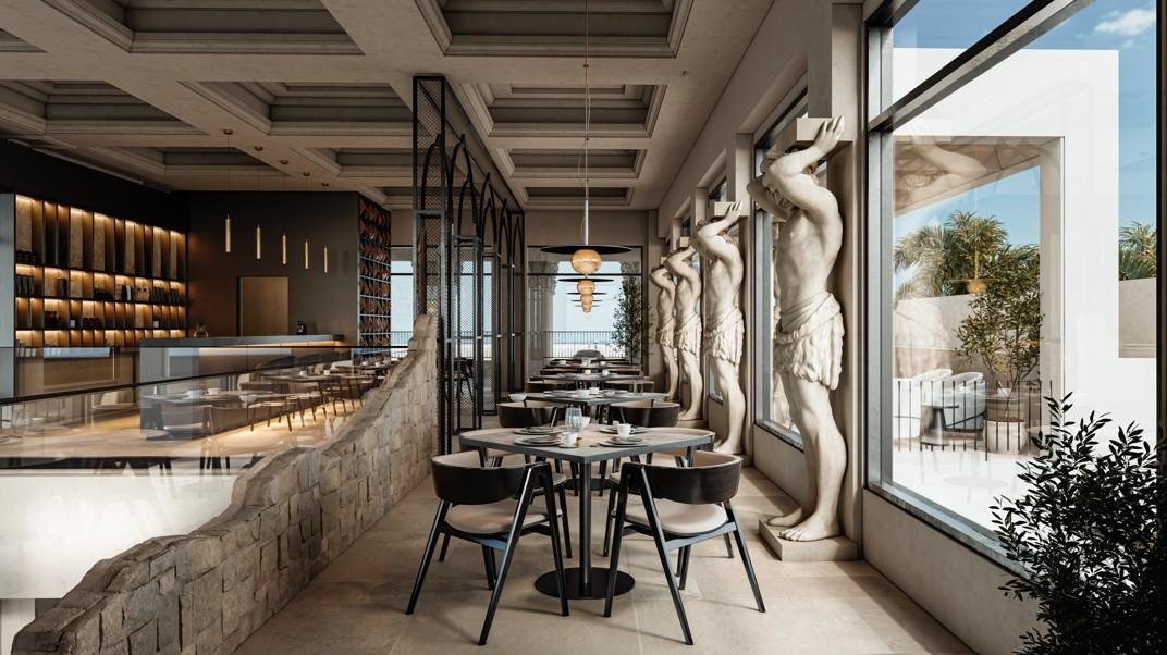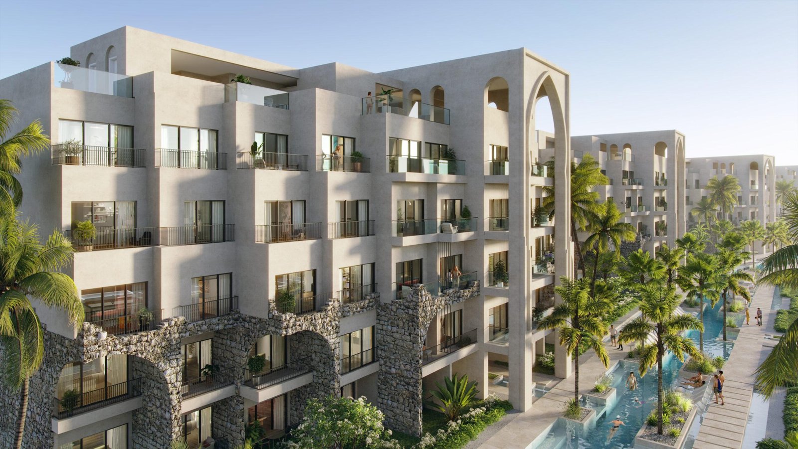 The project features classically inspired architecture, with elegant columns, landscaped courtyards and refined communal areas that recall European villas, reinterpreted in a contemporary Caribbean setting. Apartments come fully furnished, finished with high-quality materials, imported marbles, fine woods and large windows designed to maximize natural light.